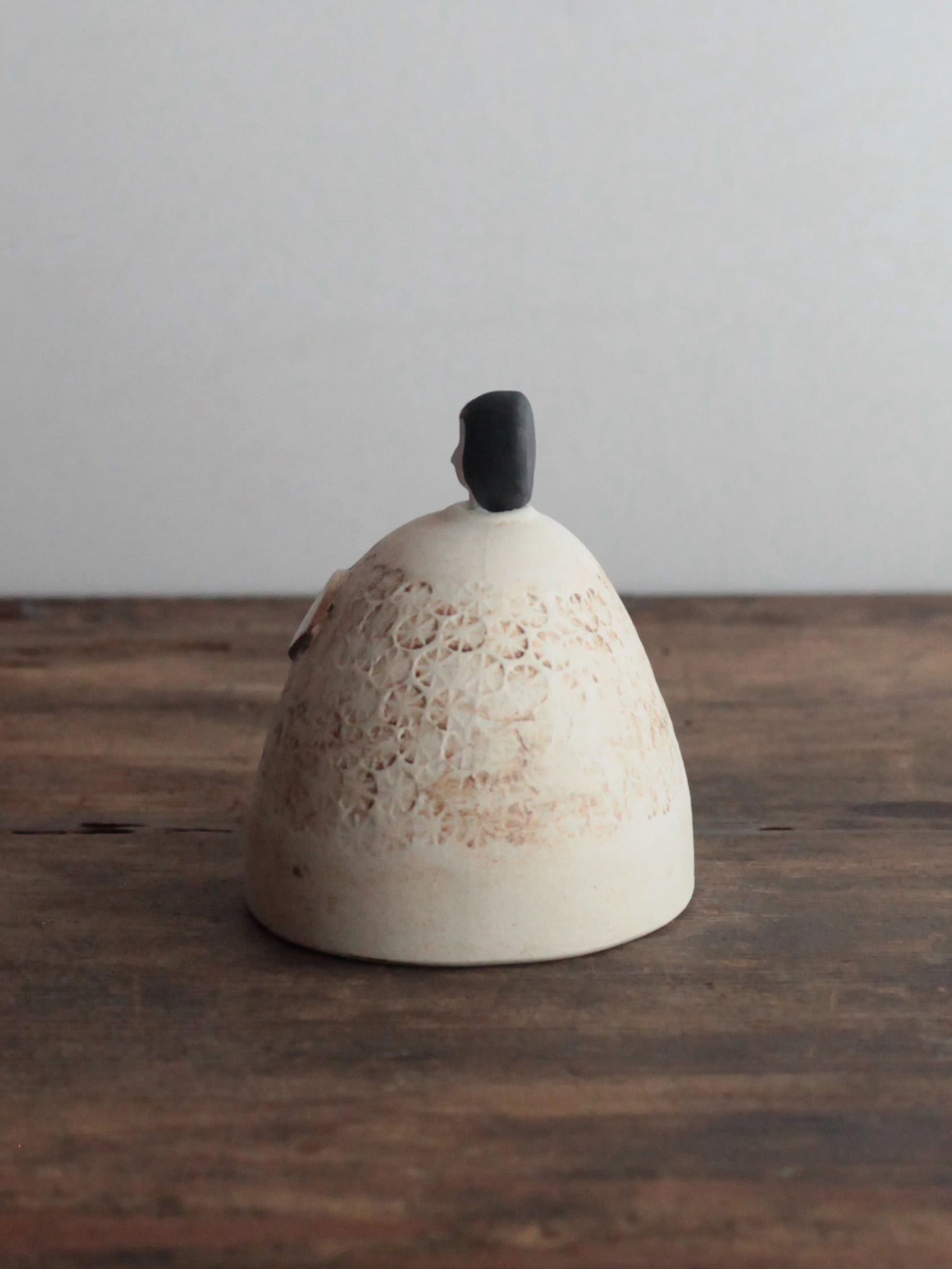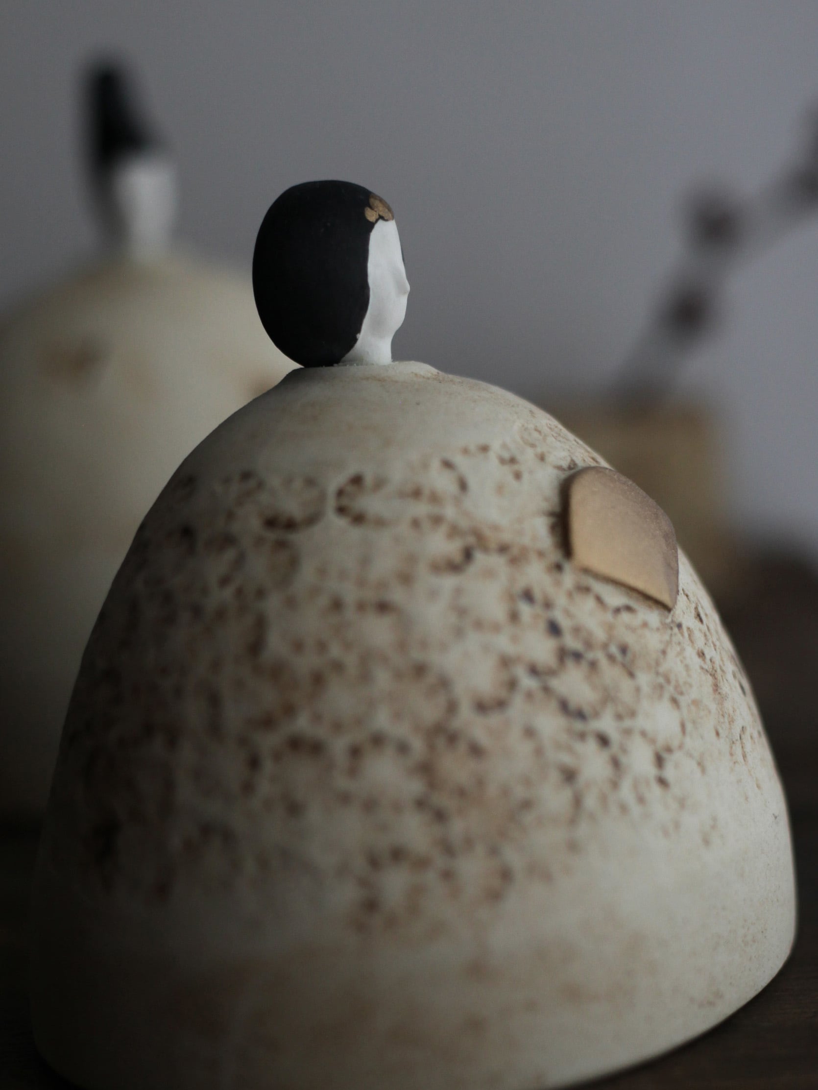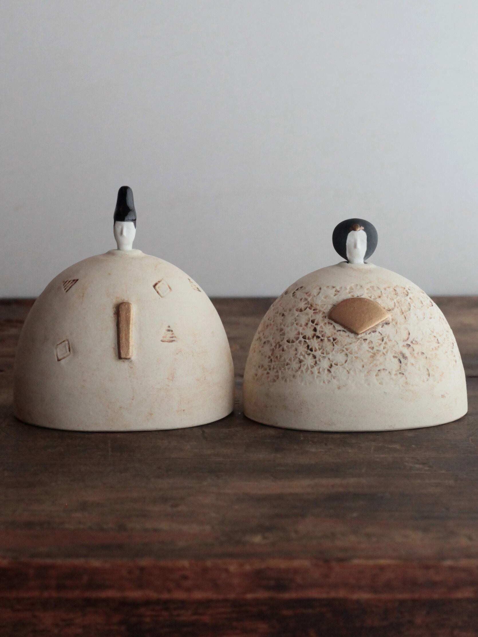 岡野香さんが一点一点手作業で制作するこの陶器の雛飾りは、毎年の変化を感じる特別な作品です。作家自身の成長と共に、その年ならではの個性が宿るため、まさに世界でたった一つしかないお雛様です。